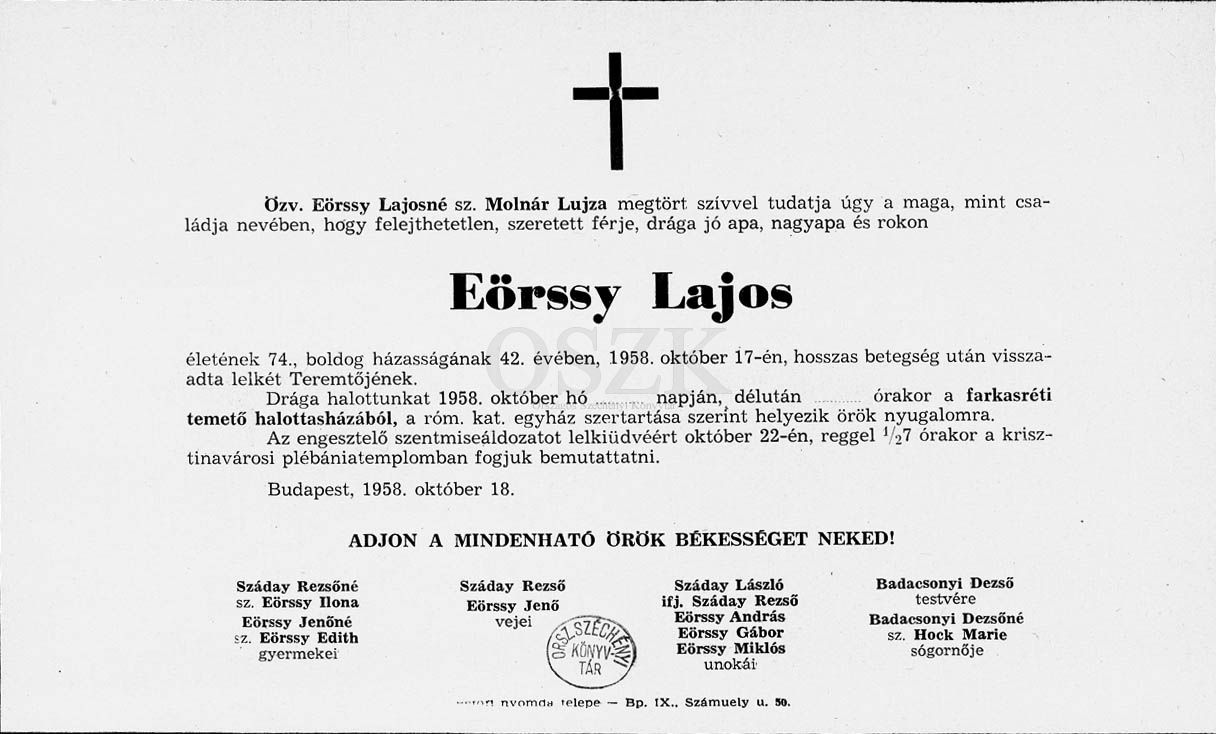 Eörssy Lajos gyászjelentése