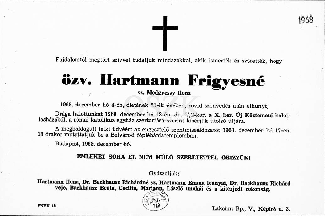 Hartmann Frigyesné Medgyessy Ilona gyászjelentése