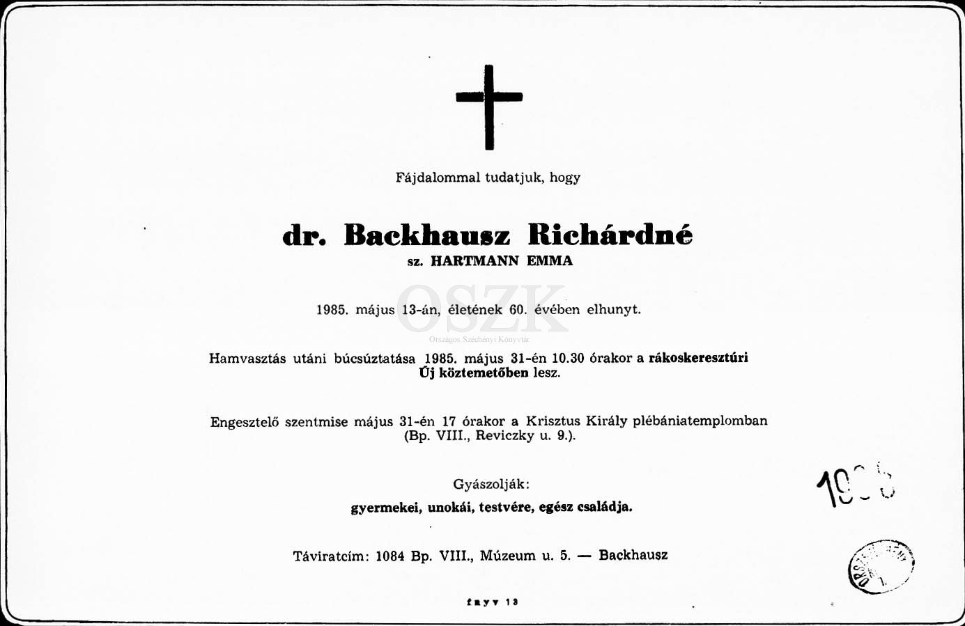 Backhausz Richárdné Hartmann Emma gyászjelentése