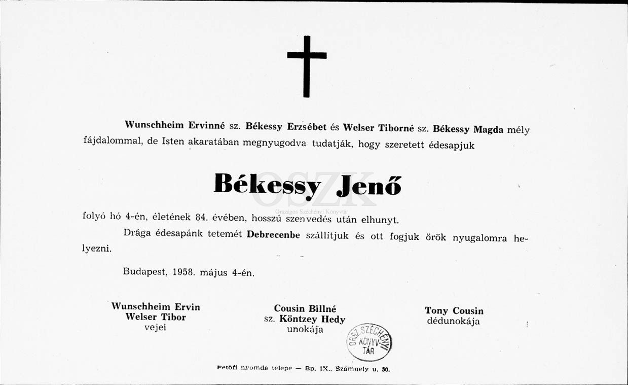 Békessy Jenő gyászjelentése
