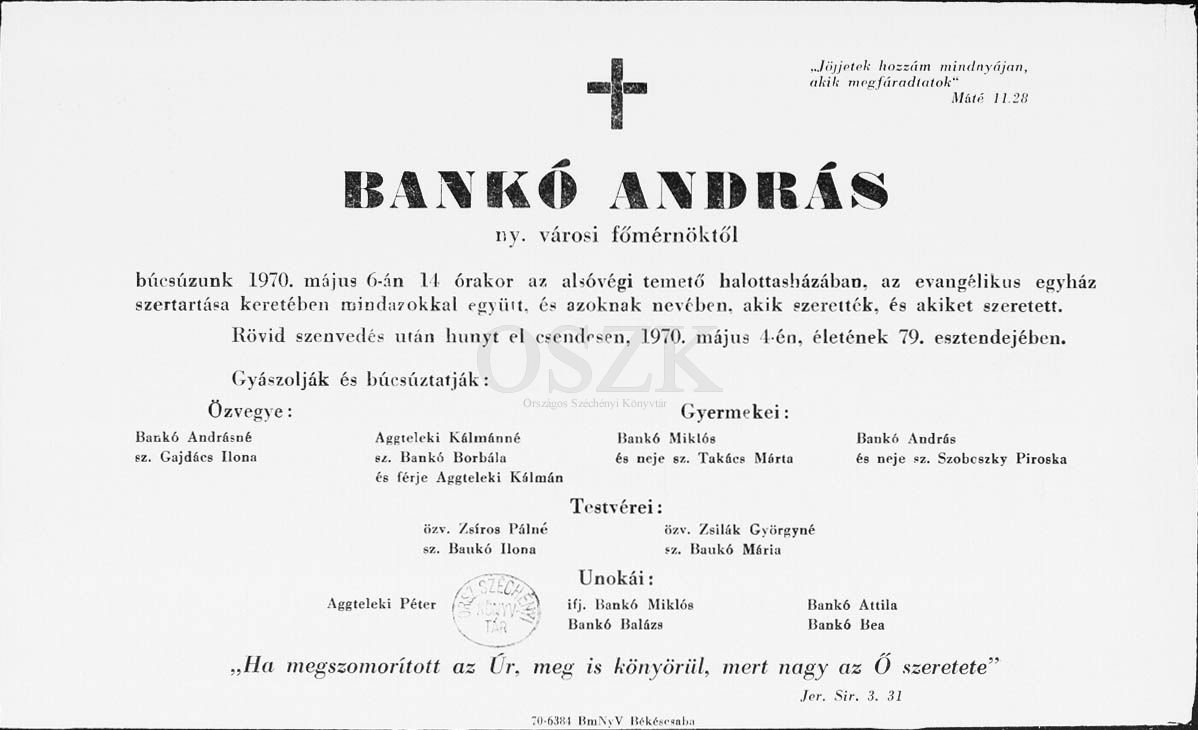 Bankó András gyászjelentése