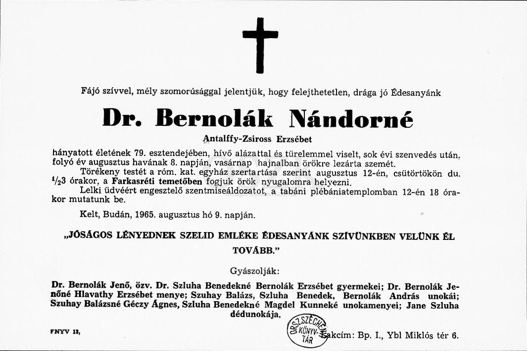 Bernolák Nándorné Antalffy Zsiross Erzsébet gyászjelentése