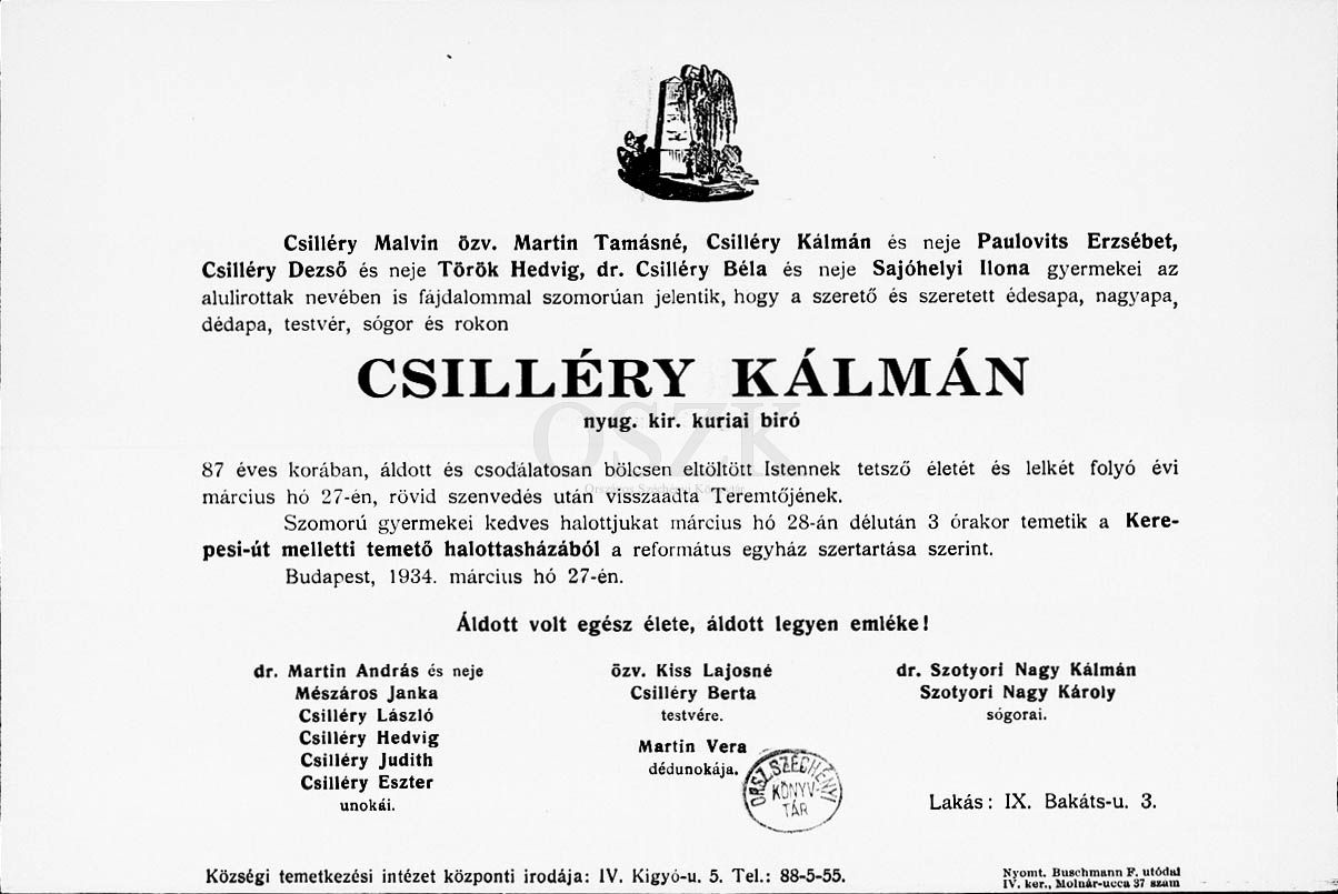 Csilléry Kálmán gyászjelentése