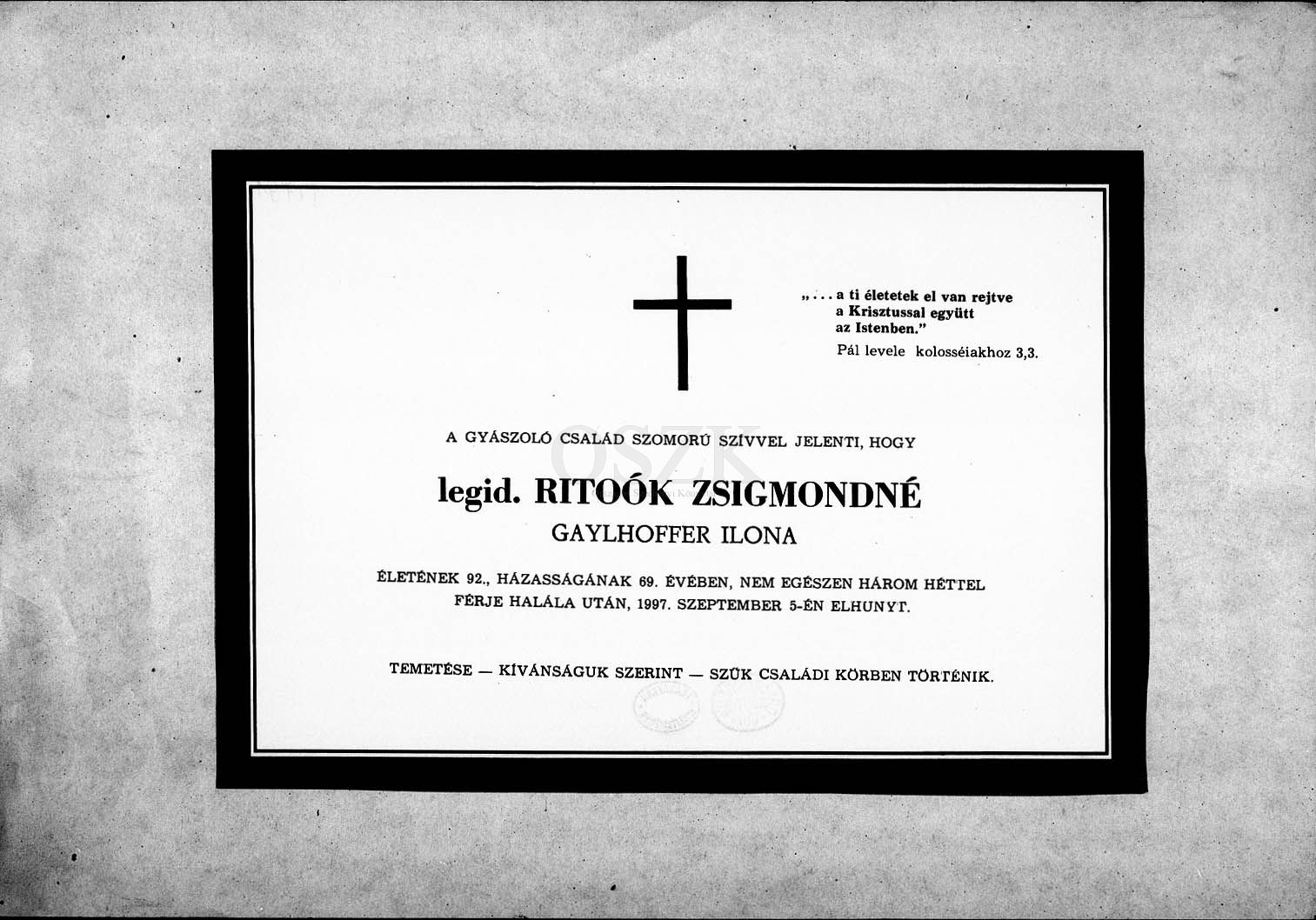Ritoók Zsigmondné Gaylhoffer Ilona gyászjelentése