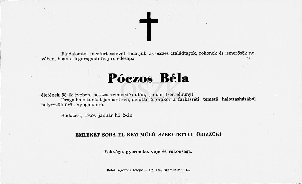 Póczos Béla gyászjelentése