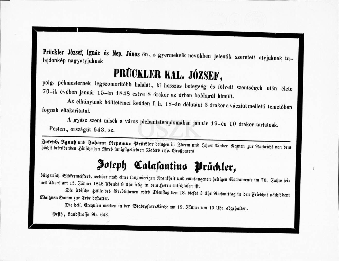 Prückler Kal. gyászjelentése