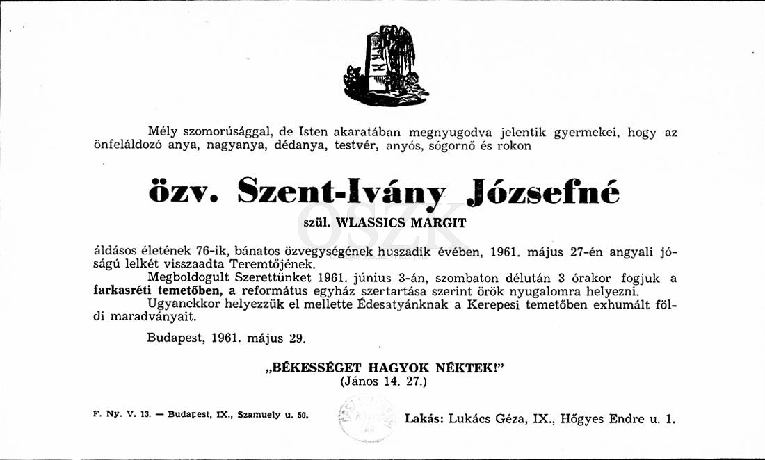Szent-Ivány Józsefné Wlassics Margit gyászjelentése